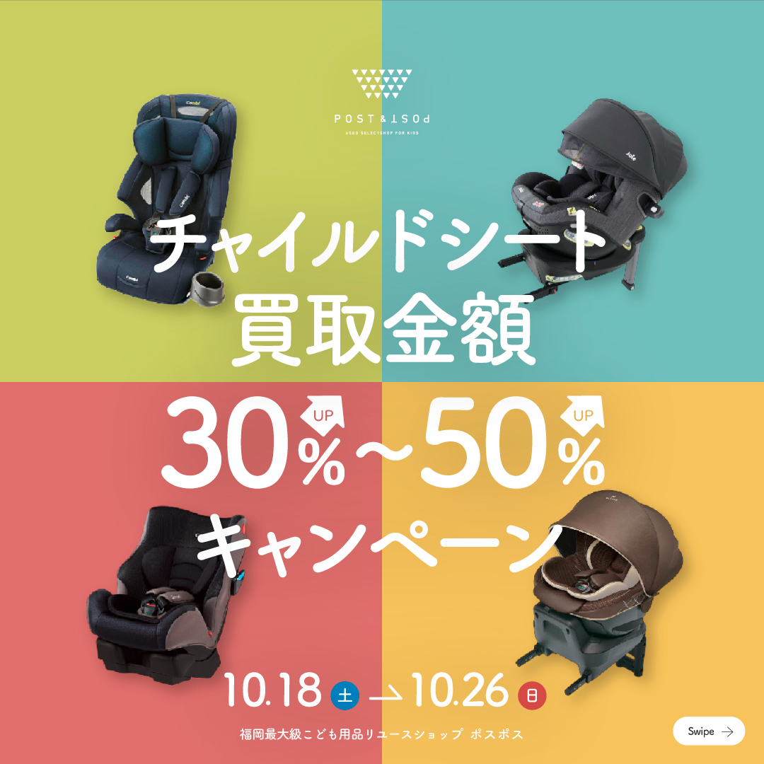 【9日間限定】チャイルドシート買取額30%~50%UPキャンペーン! 2025.10.06お店のこと, ポスポスマルシェ, ポスポス土井店, ポスポス石丸, ポスポス長住店 HOME ブログ お店のこと , ポスポスマルシェ , ポスポス土井店 , ポスポス石丸 , ポスポス長住店 【9日間限定】チャイルドシート買取額30%~50%UPキャンペーン! 福岡最大級!こども用品大型リユースショップ「ポスポス」では、期間限定でチャイルドシート全品、買取額30%アップいたします。役目を果たしたチャイルドシートがございましたら、この機会にお持ち込みください。 キャンペーン概要 期間 10/18(土)~10/26(日) 対象アイテム チャイルドシート、ジュニアシート、ベビーシート 店舗 マルシェ含む全店舗 査定受付時間 10:00~16:00※対象商品のみお持ちの方はご予約不要です。 買取事例 アイテム別のご注意点 お持込前に、事前チェックをお願いしたいアイテムについてご案内します。 チャイルドシート インナークッションもお忘れなく。2012年以前のものは安全性基準が現行法律に合わないため買取できません(「自」シールがついているお品物) ポスポスで取り扱う品物は、次のご家庭で使っていただくアイテムです。その他ベビー用品もカビが生えていたり、破損している商品は復旧が難しく、次のお客様にお渡しすることができず、廃棄せざるえません。その場合は、お持ち帰りいただくことになります。事前に、ご確認したうえでご用意いただけたら幸いです。 お店のこと, ポスポスマルシェ, ポスポス土井店, ポスポス石丸, ポスポス長住店 チャイルドシート, ポスポス, 買取 【16日間限定】チャイルドシート買取額30%~50%UPキャンペーン! 2025.11.28(金)棚卸しによる休業のお知らせ